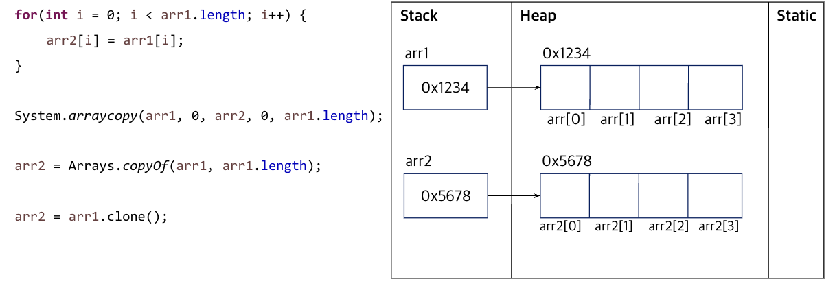 - 새로운 배열 생성 후 데이터를 복사해서 서로 독립된 배열로 만드는 방식