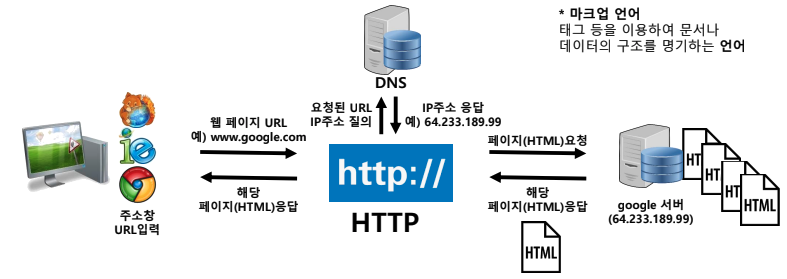 HTML이라는 마크업(Markup) 언어를 통해 자료를 주고 받음