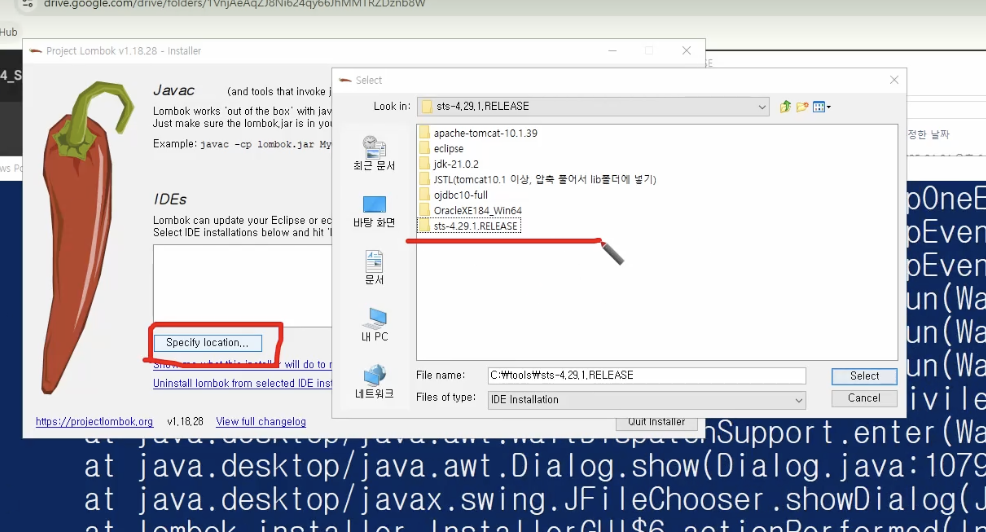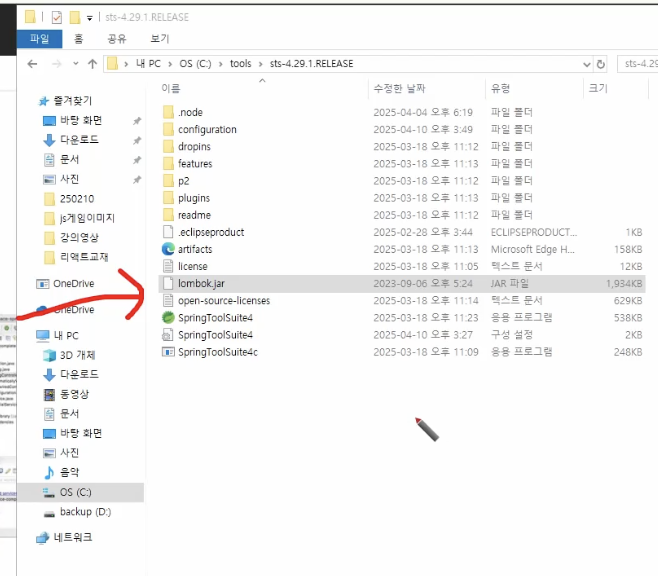 해당 sts 폴더에 lombok 파일 설치 또는 복사 (수업시간때 이미 설치한 파일이 있어 우리는 복사했다)
